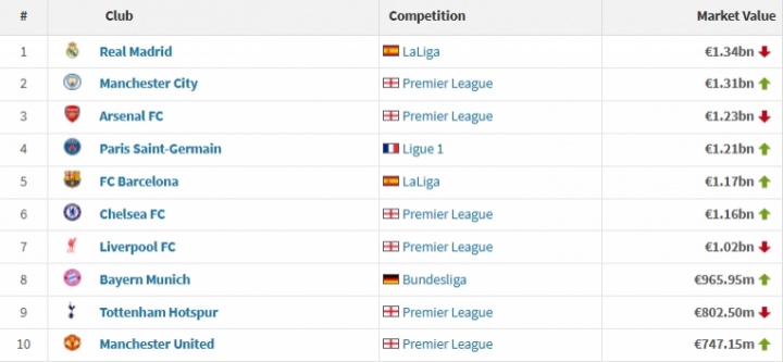 附欧洲身价前十俱乐部(单位:欧元):