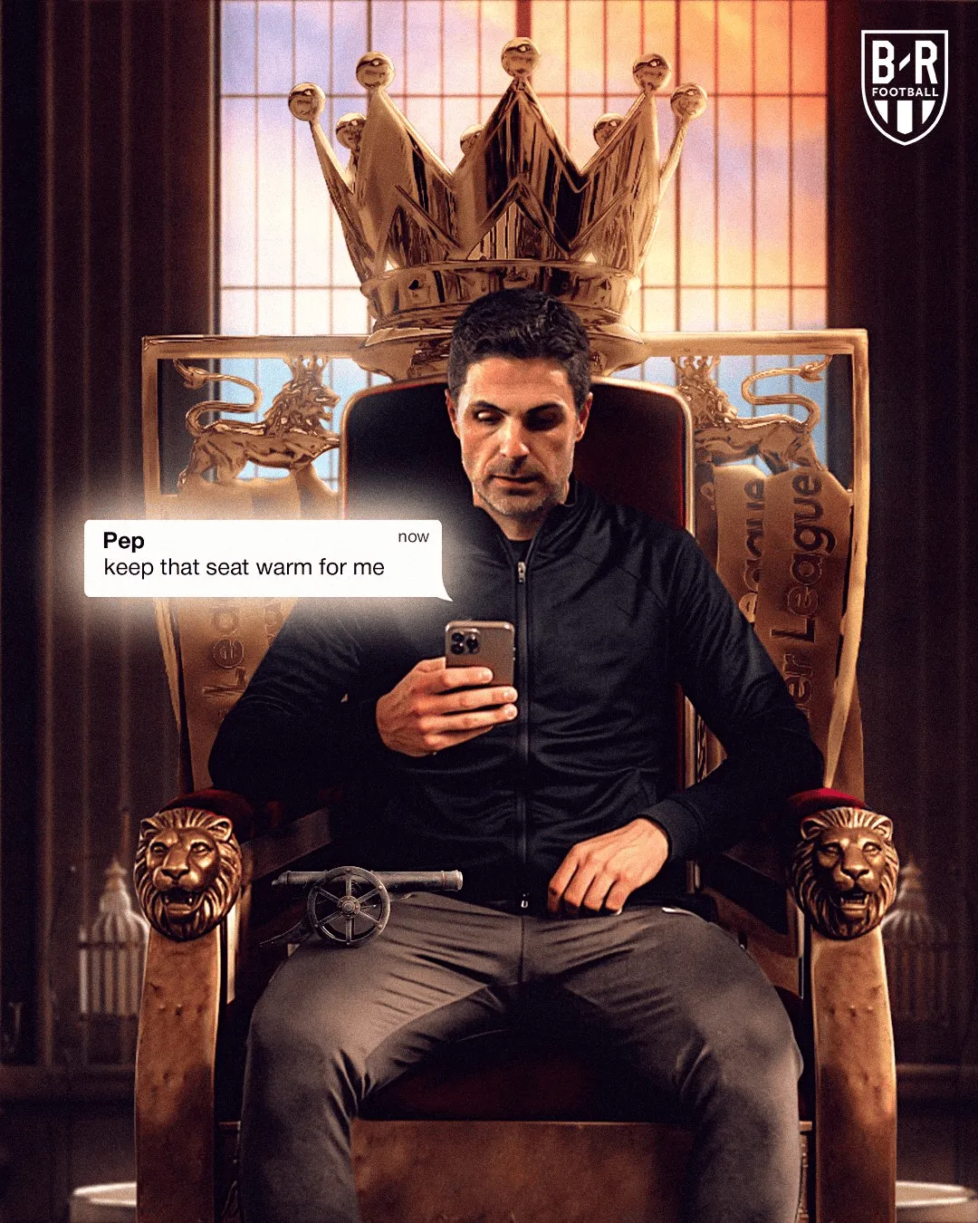 虎扑04月26日讯 在1-0小胜纽卡之后,阿森纳再度反超曼城,重返积分榜首位。B/R Football随即发布创意海报:阿尔特塔坐在王座之上,手机中弹出一条来自瓜迪奥拉的消息——“先帮我把位置坐热”。